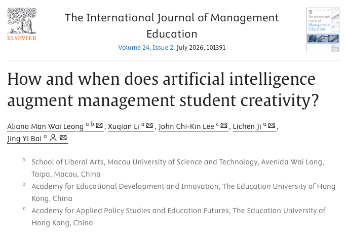 澳門科技大學博雅學院休閒管理首屆博士研究生李旭茜與吉利晨取得突破性學術成果,於國際權威學術期刊 International Journal of Management Education 發表最新研究論文,題為How and when does artificial intelligence augment management student creativity?(人工智能如何及何時增強管理學生的創造力?)。此項研究探討人工智能技術在管理教育中的創新應用,為數字化時代的商業人才培養提供重要理論與實踐啟示。